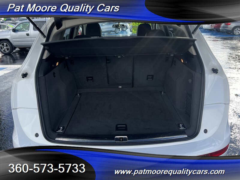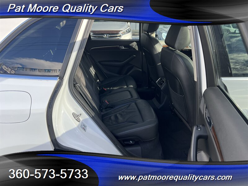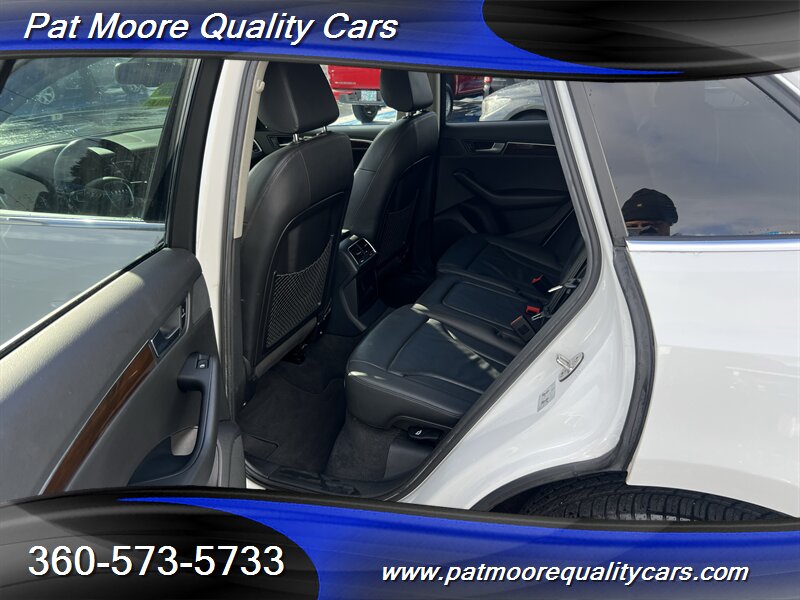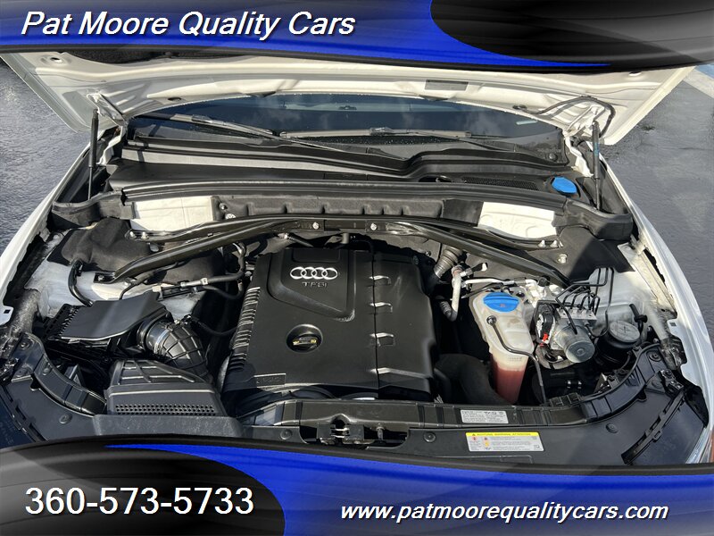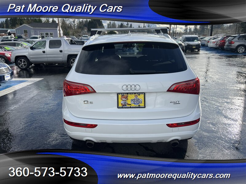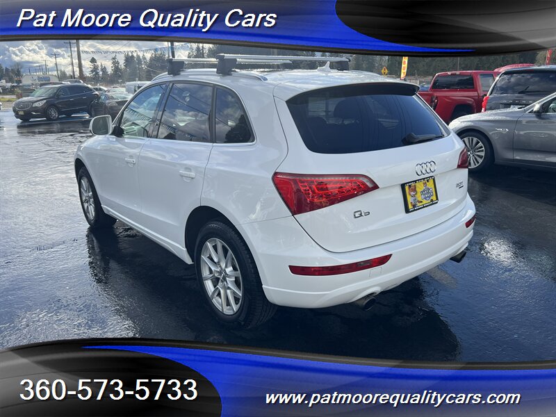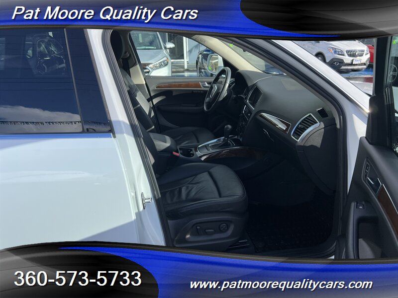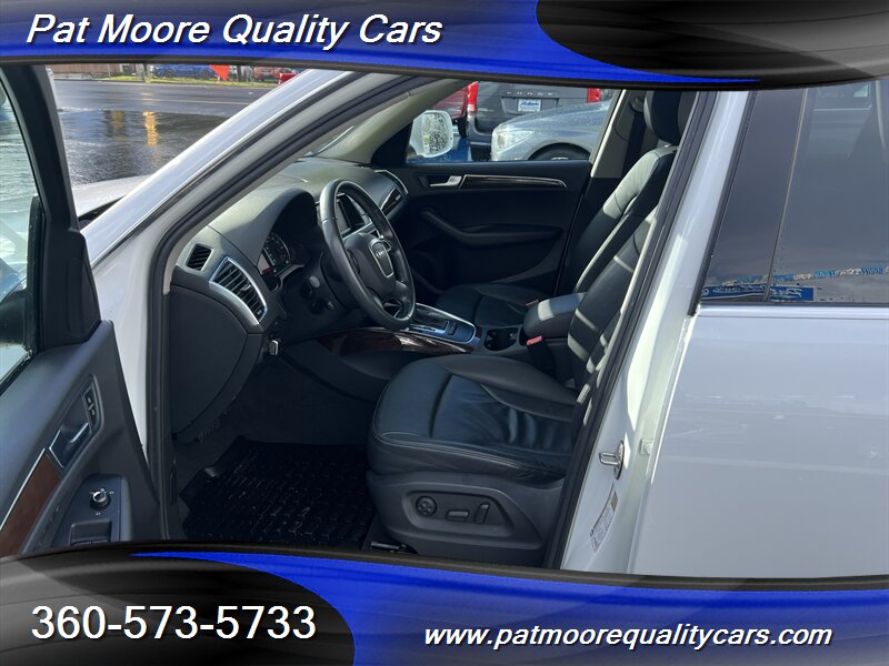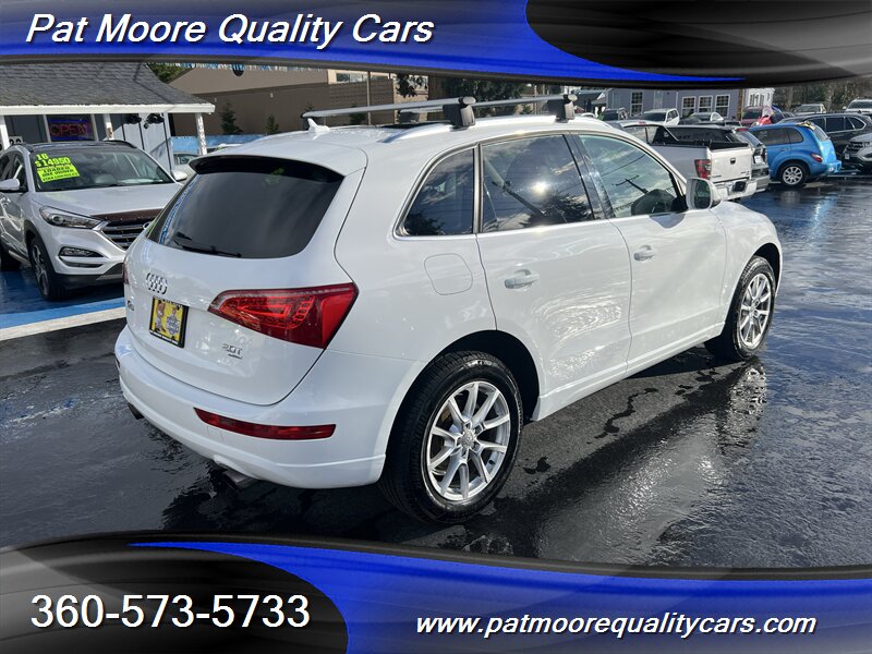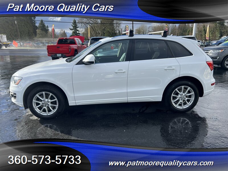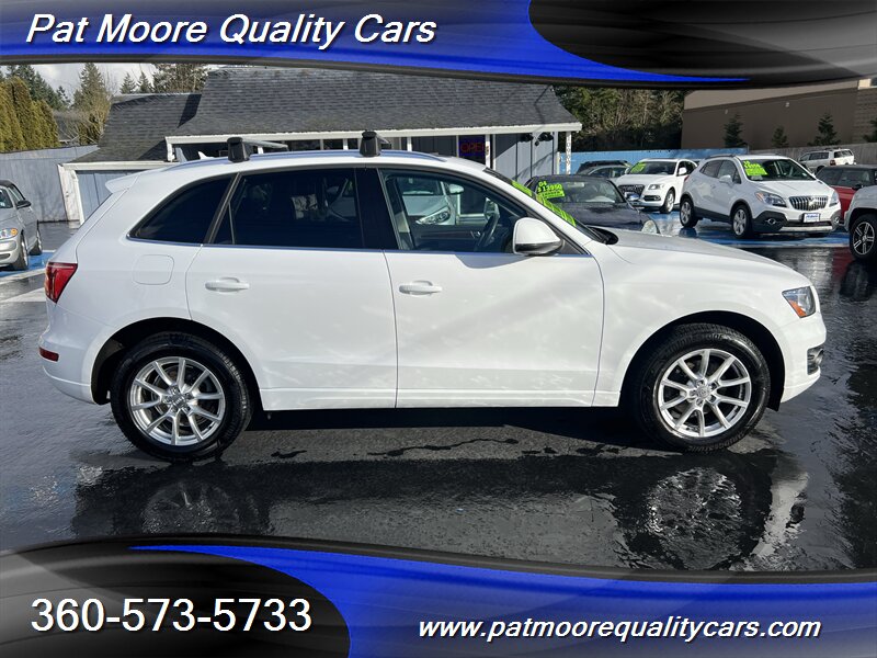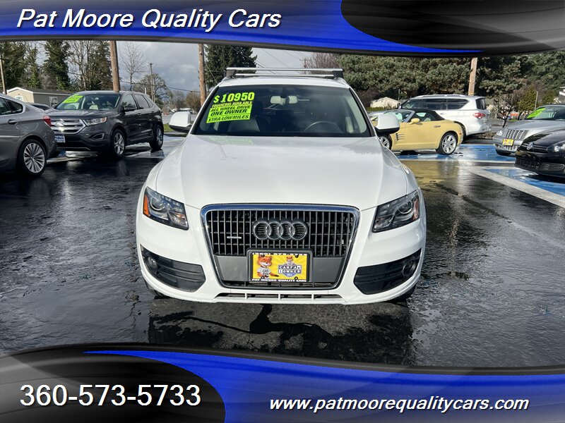 2011 Audi Q5 2.0T quattro Premium Plus ? Ibis White exterior / Black interiorOverviewThis 2011 Audi Q5 2.0T quattro Premium Plus is powered by Audi?s 2.0L turbocharged inline-4 producing 211 hp and 258 lb-ft of torque, paired with an automatic transmission and Audi?s quattro all-wheel-drive system. The vehicle is finished in Ibis White with a Black interior and remains in excellent overall condition. It has under 74,000 miles (averaging less than 5,000 miles per year), a clean CARFAX report, and a single previous owner. EPA fuel economy is approximately 20 MPG city and 27 MPG highway.Factory-equipped features ( Premium Plus )This Premium Plus model comes with a well-appointed factory equipment package that combines convenience, comfort, safety and Audi?s characteristic refinement. Key factory features include:Powertrain and chassis- 2.0L turbocharged I4 (211 hp / 258 lb-ft) mated to an automatic transmission- quattro permanent all-wheel drive for improved traction and stability- Electronic Stability Control (ESC), Anti-lock Braking System (ABS) and traction controlExterior- Ibis White paint finish- Premium alloy wheels (factory-specified size for Premium Plus; visually styled Audi alloys)- Xenon/high-intensity discharge (HID) headlights with integrated daytime running lights- Front fog lamps- Power-operated panoramic sunroof (large glass roof spanning front and rear roof openings)- Roof rails for added cargo flexibility- Power liftgate for convenient rear cargo accessInterior and comfort- Black leather seating surfaces and trim accents- Heated front seats with multiple power adjustments on the driver?s side- 5-passenger seating configuration with a folding 40/20/40 split rear seat for expanded cargo versatility- Dual-zone automatic climate control for separate driver and front passenger temperature settings- Leather-wrapped multifunction steering wheel (audio, phone and cruise controls)- Power windows and power door locks with remote keyless entry- Cruise control- Interior storage compartments and center armrestInfotainment and connectivity- Factory audio system with AM/FM radio and CD playback- Auxiliary audio input and Bluetooth connectivity for hands-free calling and audio streaming- Steering-wheel audio controls and in-dash display for system information- Available Audi MMI interface and upgraded audio options were commonly offered on Premium Plus-equipped vehicles as factory optionsSafety and convenience- Full suite of airbags (front, side, and curtain airbags)- Tire Pressure Monitoring System (TPMS)- Rear child seat anchors (LATCH)- Rear parking sensors (commonly included on Premium Plus) and available rearview camera as factory options- Anti-theft alarm and immobilizer systemCondition and history- Excellent overall condition both mechanically and cosmetically- Below 74,000 miles (averaging under 5,000 miles per year)- Clean CARFAX report with one previous ownerThis Q5 combines Audi?s turbocharged performance and quattro capability with a Premium Plus equipment level that emphasizes comfort and convenience. If you?d like a detailed equipment list specific to this vehicle (option codes, wheel size, and any dealer-installed accessories), that information can be provided from the factory sticker or build sheet.At Pat Moore Quality Cars we try to carry some of the nicest, cleanest and well priced cars in the Portland/Vancouver area and have been doing so for over 32 years. All of our vehicles have a complete Carfax History report , and have been inspected and serviced by an A.S.E. certified mechanic. Our vehicles also include a 30 day/1,000 mile power-train warranty. We pride ourselves on being no pressure oriented, and if you just want to look around that's fine. Please feel free to call if you have any questions at 360-573-5733.Disclaimer:Any agreement is subject to execution of contract documents, until such time all vehicles are subject to prior sale. It is the custom