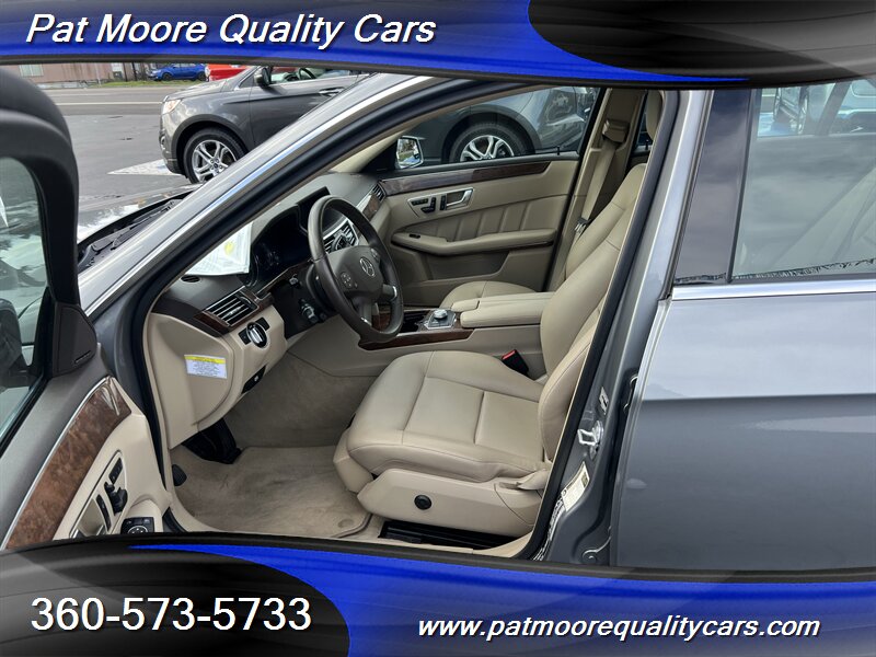 2012 Mercedes-Benz E 350 Luxury — Steel Grey Metallic exterior with Almond Beige interior. Powered by a 3.5L V6 producing 302 hp and 273 ft·lb of torque, paired with a seven-speed automatic transmission. This sedan shows excellent overall condition and a clean CARFAX report. Mileage is under 70,000 miles (averaging less than 5,000 miles per year). EPA ratings are approximately 20 MPG city and 30 MPG highway.